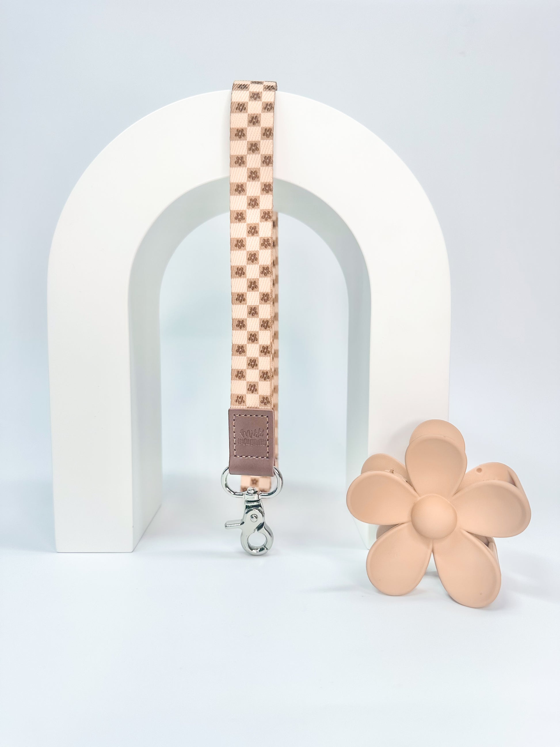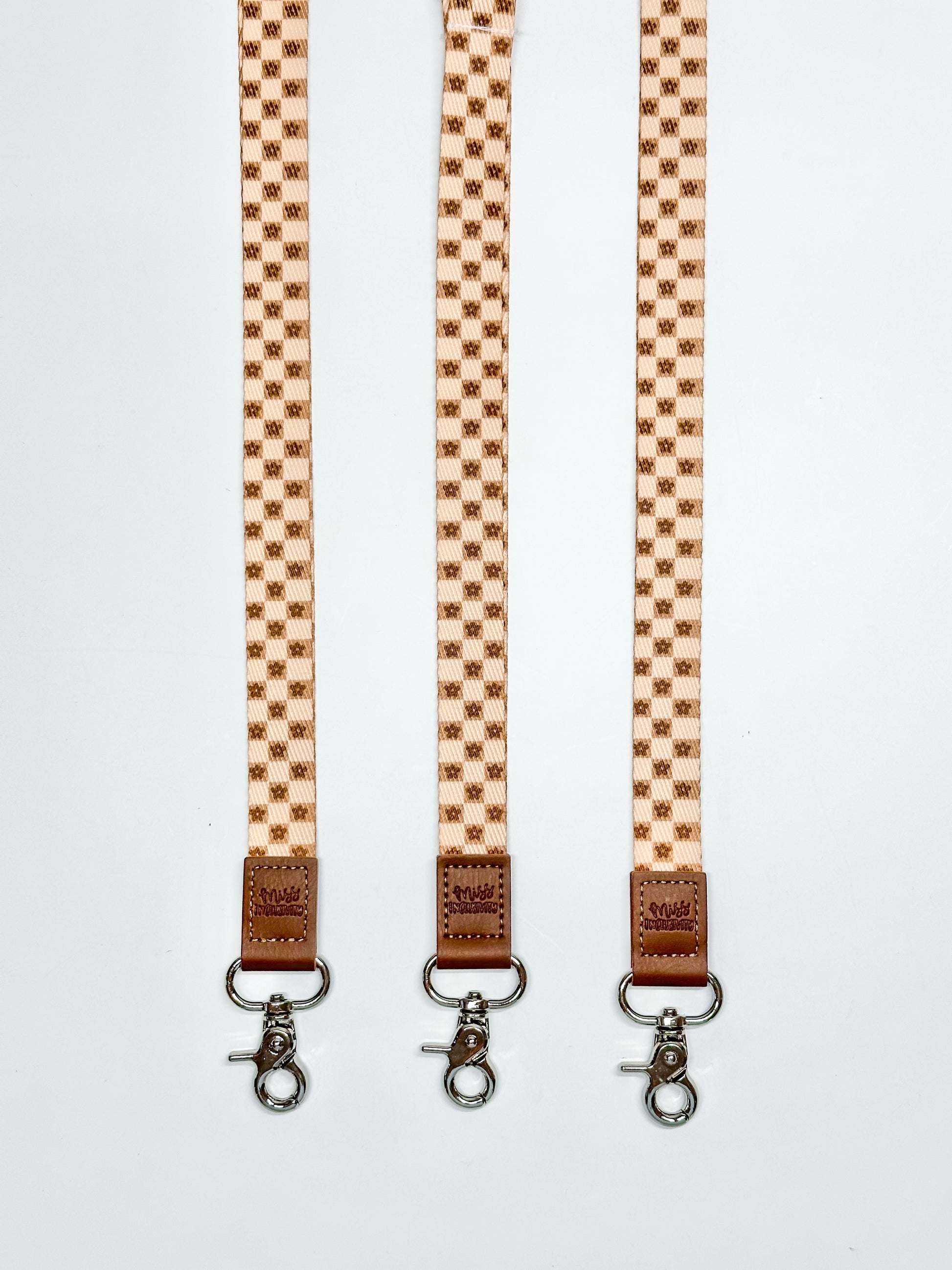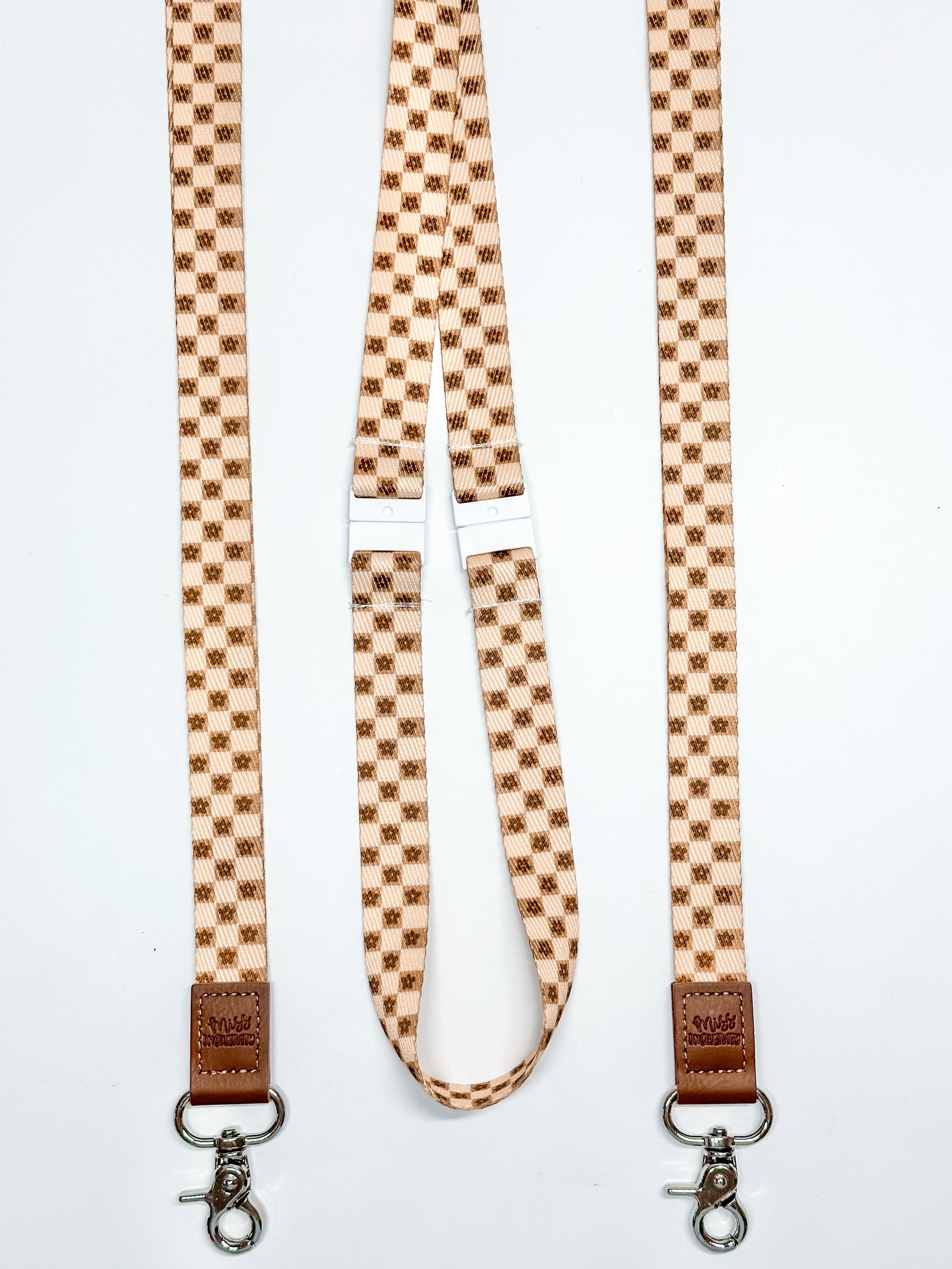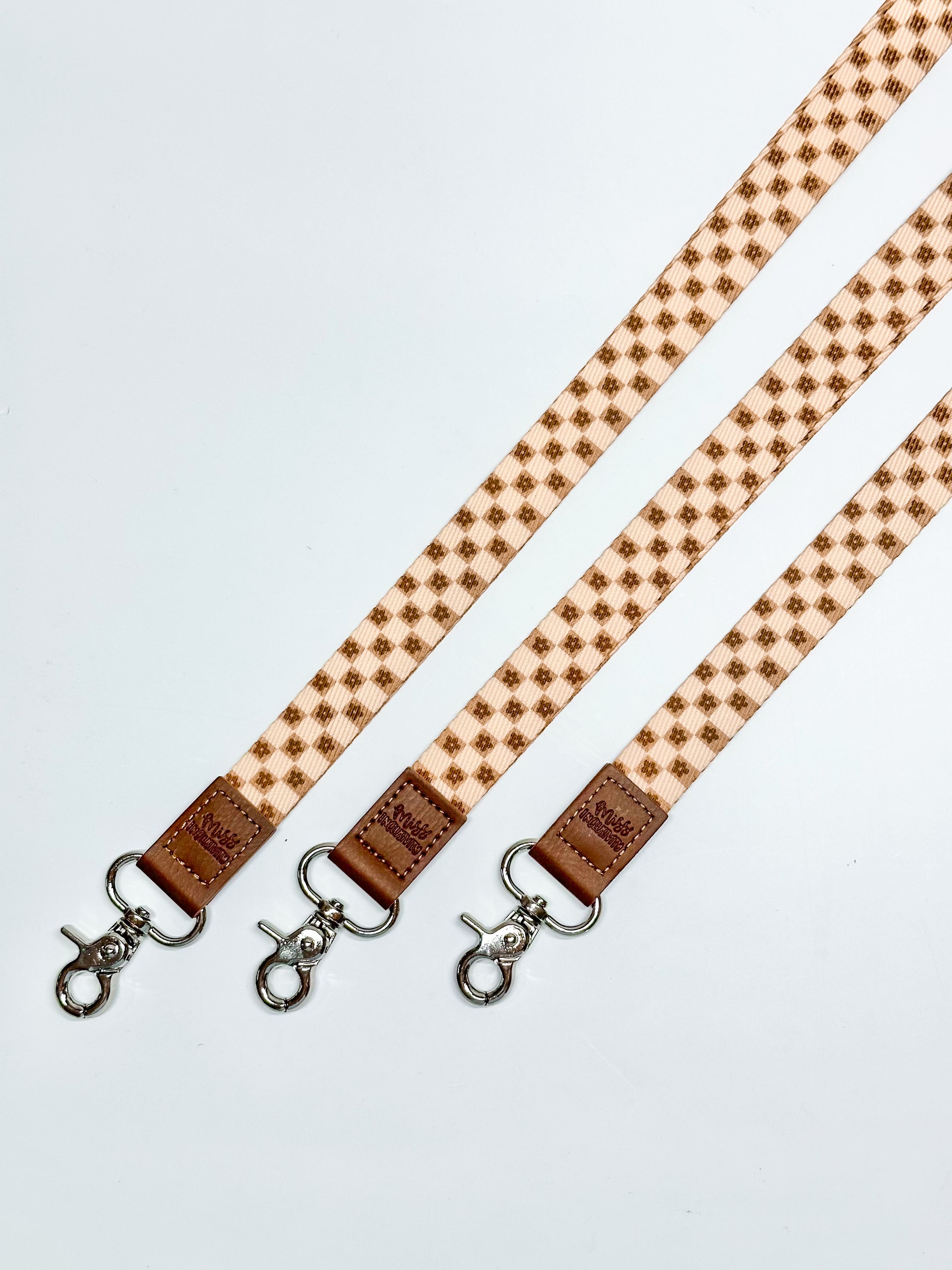 Featuring a unique checkered pattern with small floral accents, this lanyard is both stylish and functional. Made with vegan leather and a metal clasp, it's perfect for keeping your keys or ID handy at all times. (Lanyard game strong!)