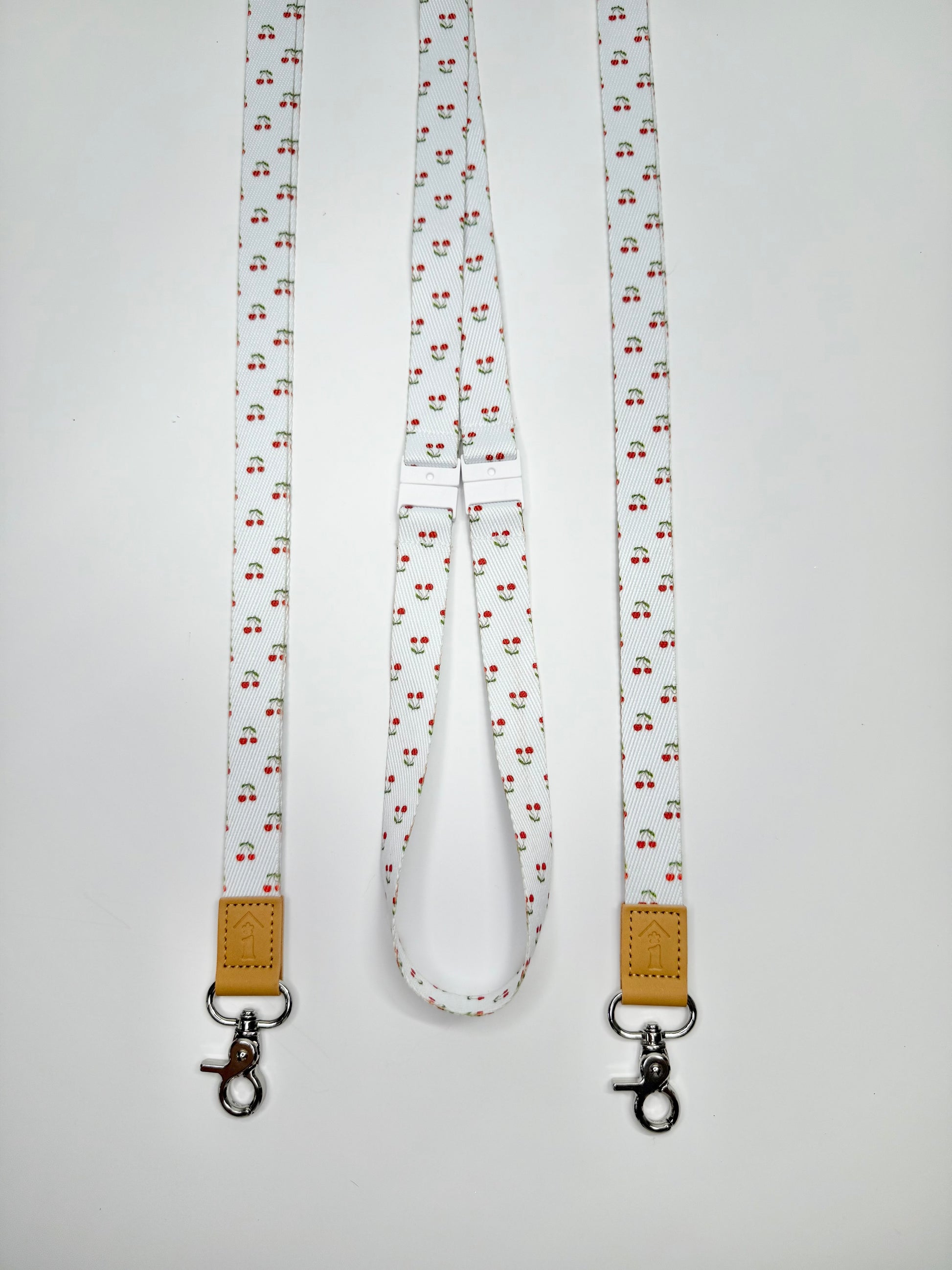 This quirky Cherries Lanyard features a white fabric background adorned with delicious cherries, plus a vegan leather attachment and silver clasp to securely hold your belongings. Complete with a white breakaway clasp for added safety.