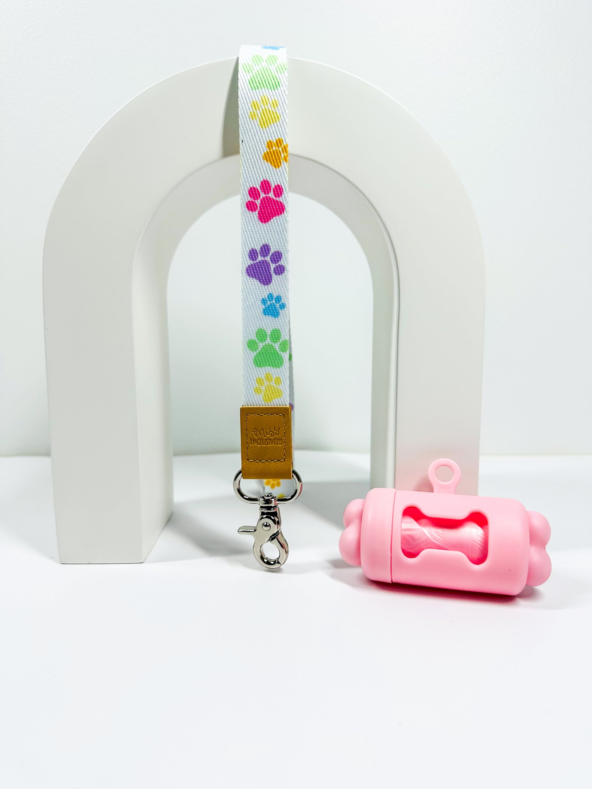 Complete any ensemble with this Furry Friends Lanyard! Adorned with paw prints in a pastel rainbow, it's the perfect symbol of your love for your pets. Crafted with vegan leather for a touch of luxe, you can now wear your furry love on your sleeve—literally!