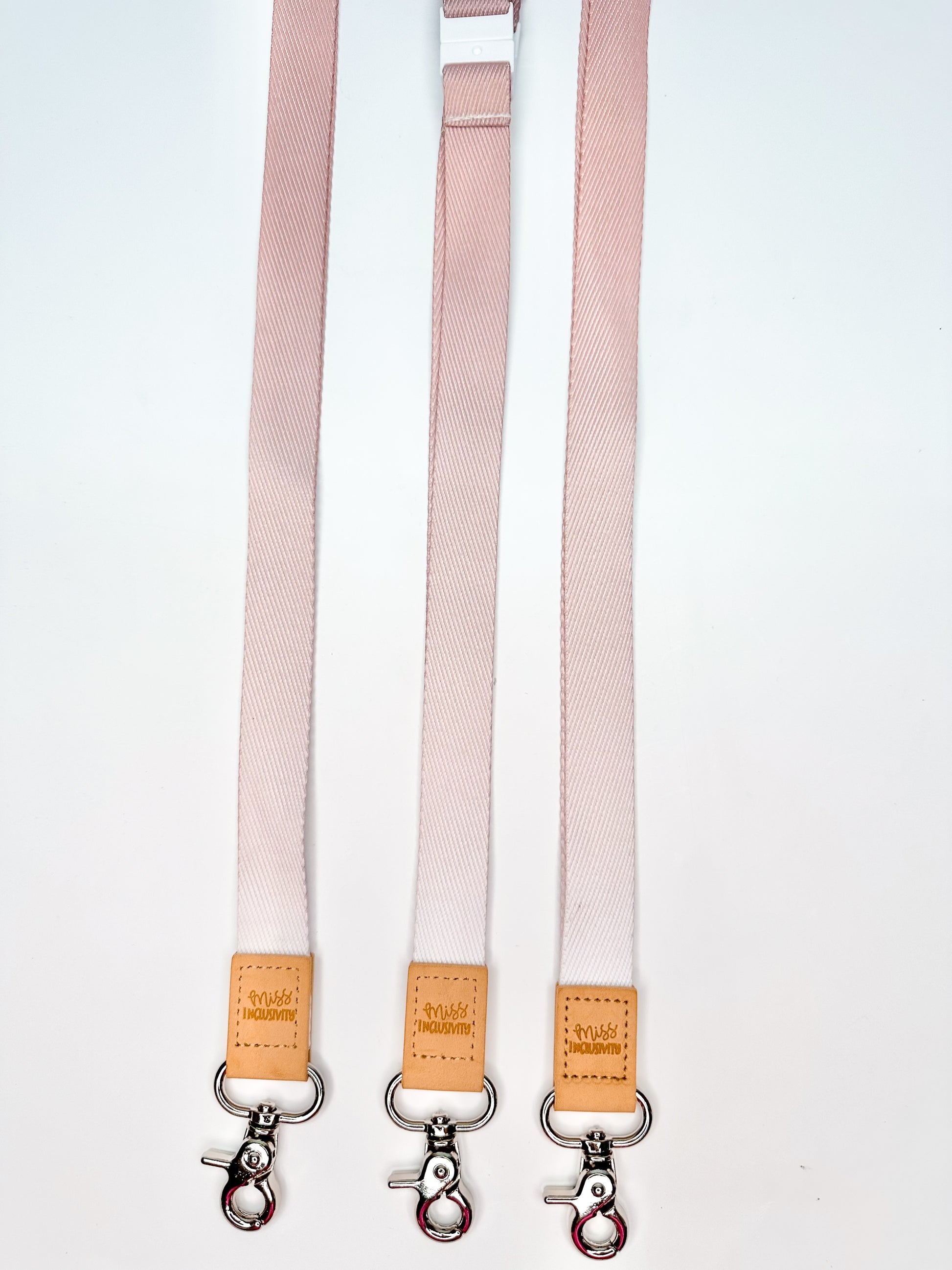 The Grevillea Ombre Lanyard is expertly crafted with a soft ombre fabric, featuring a light pink undertone for a touch of elegance. Its vegan leather support and white breakaway clasp ensure both comfort and safety. Keeping your essentials easily accessible, the lanyard also boasts a secure silver metal clasp at the bottom.