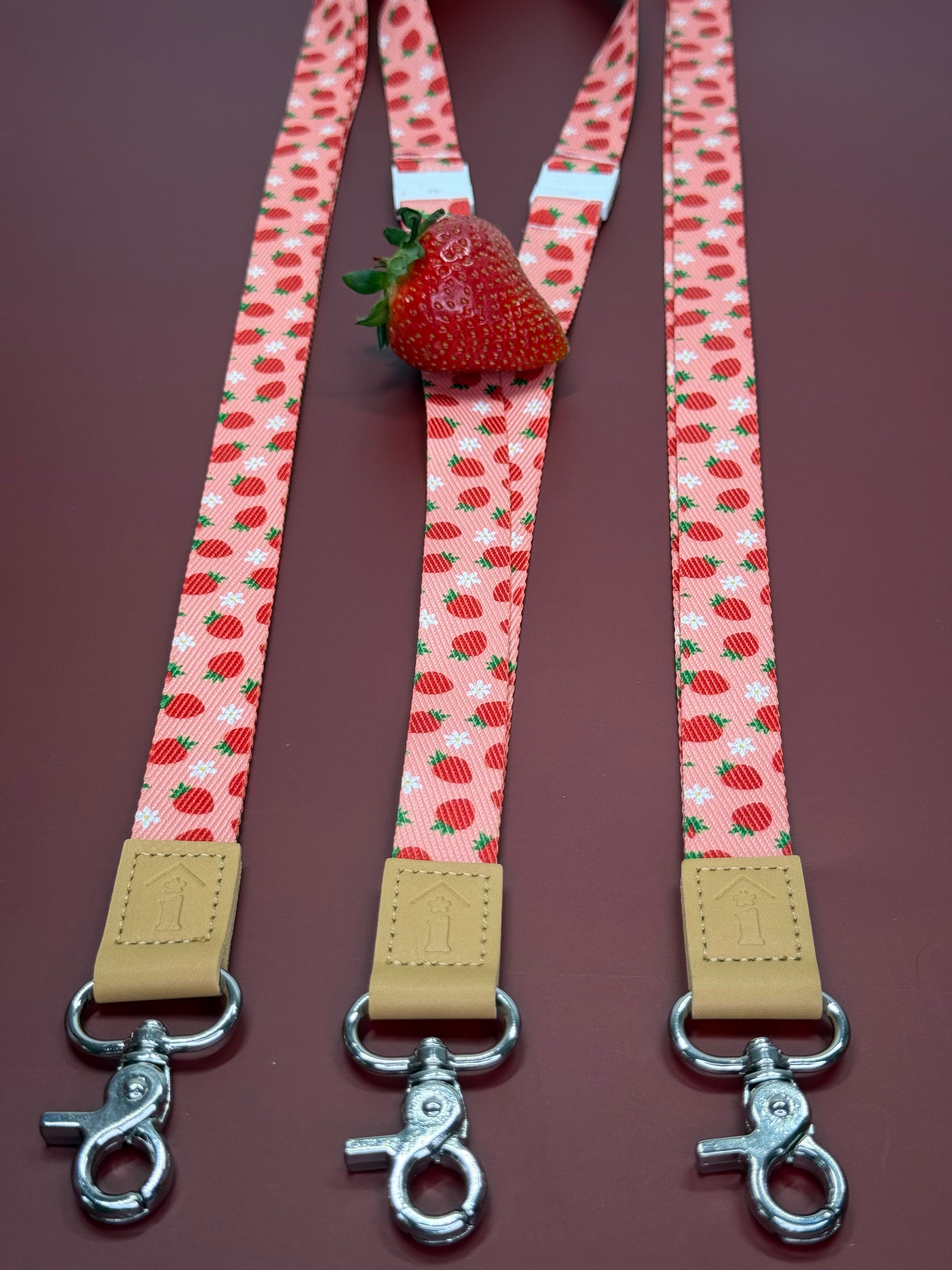 Stay stylish and safe with our Strawberry Kisses Lanyard! Made with a fabric background of juicy strawberries, it features a vegan leather bottom and a silver clasp to hold all your belongings. Plus, a white breakaway clasp ensures your safety. (P.S. It's berry cute!)