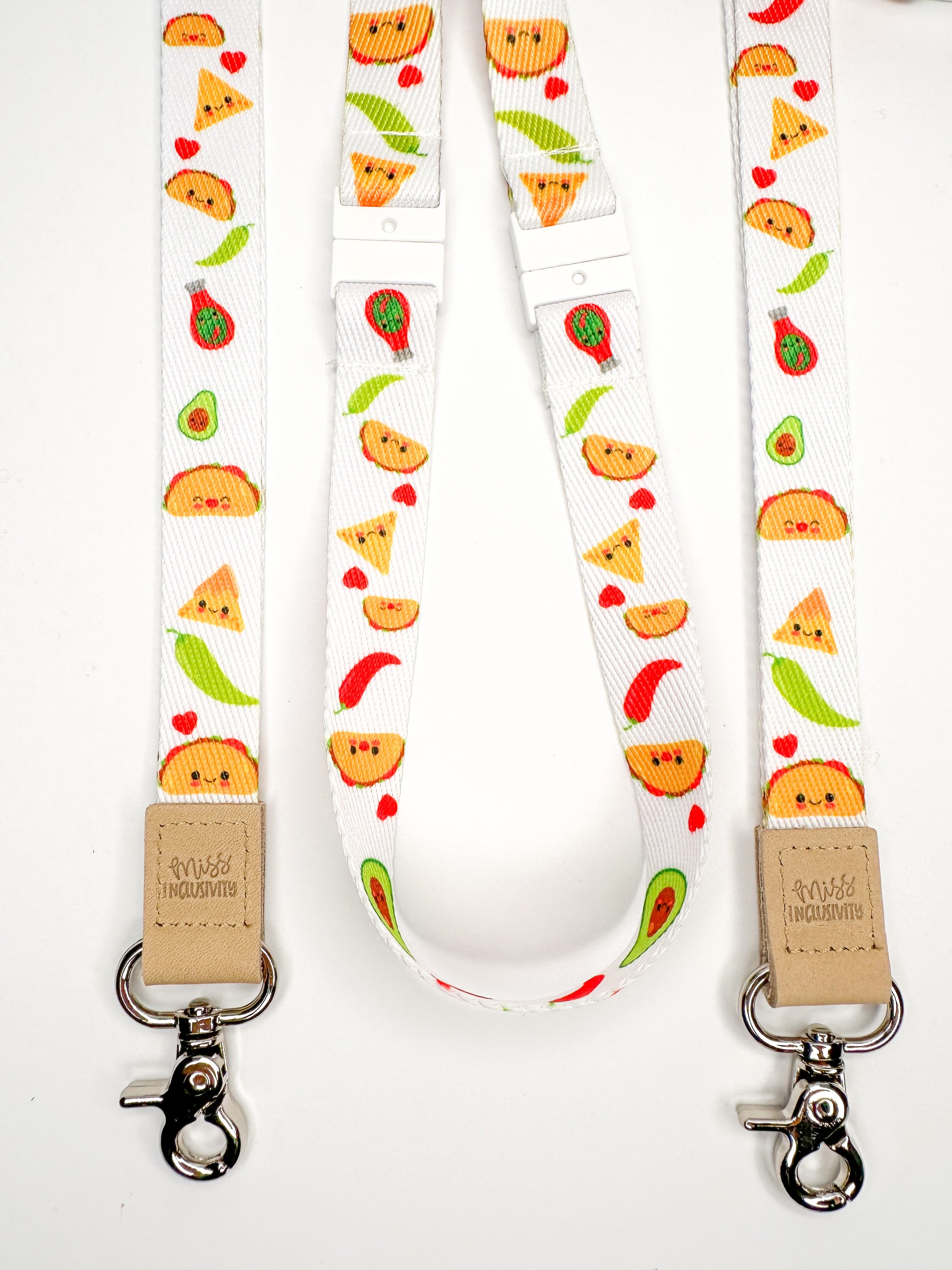 Taco Tuesday Lanyard is a fun choice to make any outfit more lively. It features a fabric lanyard with white breakaway clasps for easy on-and-off. The unique lanyard also features a Taqueria-inspired pattern of tacos and other Mexican food. It's the perfect way to make any occasion just a little bit more fun.